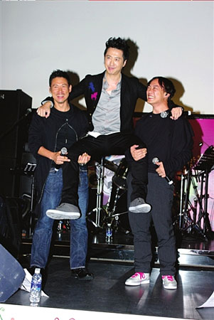 發(fā)布會現(xiàn)場,心情不錯(cuò)的庾澄慶經(jīng)常大笑得前仰后合,張學(xué)友和陳奕迅更是讓他興奮不已。兩位好哥們兒送上大包的零食,祝福庾澄慶在香港更加“吃得開”。在哥兒仨開唱之前,張學(xué)友特別提醒眾人:“請大家注意歌詞!扁壮螒c哭笑不得地唱起了《愛你的只有一個(gè)我》,張學(xué)友和陳奕迅一邊和聲一邊搞笑地伴舞。拍合影的時(shí)候,張學(xué)友和陳奕迅合力把站在中間的庾澄慶扛上肩膀,張學(xué)友還不忘問道:“這下心情好很多了吧?”再三被追問如何對待妻子伊能靜的“外遇”,庾澄慶說:“處理完之后會告訴大家的!敝劣谑欠駬(dān)心這個(gè)時(shí)候推出新碟會被質(zhì)疑借機(jī)炒作,庾澄慶表示:“我不會拿家里的事情做新聞點(diǎn),更何況這件事情很重要。如果我不工作把自己關(guān)在家里,就是很好的解決方式嗎?不是! 記者 朱雅清