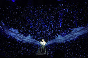 華仔昨晚除了載歌載舞,間中還穿插魔術秀、音樂劇等,其中音樂劇環(huán)節(jié),他就找來2位辣妹dancers共舞,左擁右抱,又貼身熱舞,又緊緊抱在一起;魔術秀環(huán)節(jié),還認女助手為“女朋友”,羨煞現(xiàn)場所有女歌迷!