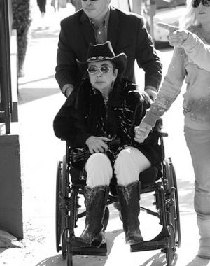 好萊塢“玉婆”伊麗莎白·泰勒19日坐著輪椅來到一家修道院!坝衿拧鳖^戴牛仔帽,鼻梁上架著一副太陽鏡,鮮紅的唇膏把臉色襯托得更加蒼白,與昔日搖滾天王邁克爾·杰克遜慣常的裝扮如出一轍。