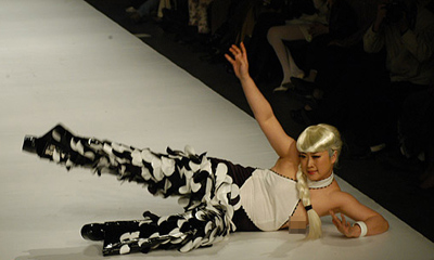 趙半狄早在發(fā)布會前就曾透露,芙蓉姐姐將穿著他設(shè)計的網(wǎng)絡(luò)紅人服出場。在時裝展示中,芙蓉姐姐頭帶金黃假發(fā)辮,身著黑白相間美人魚服裝熱舞出場,擺出各種夸張的造型。并且由于舞蹈動作過大,芙蓉姐姐頻頻“露點”。