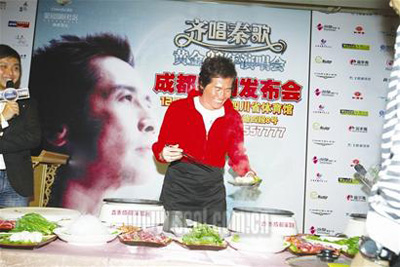 昨日新聞發(fā)布會(huì)的主題似乎是火鍋,而不是音樂(lè)。但其中的真意,齊秦非常明了:“這樣舉辦新聞發(fā)布會(huì),是想以朋友的方式和大家聊聊。在四川我做辣味火鍋拼不過(guò)你們,那我就做一個(gè)來(lái)自馬來(lái)西亞的胡椒螃蟹火鍋吧!饼R秦系上了圍裙,他面前擺滿(mǎn)了蟹肉、粉絲、肉丸子、蚌殼、蔬菜等燙料,5口蒸鍋正熱氣騰騰地翻滾著湯汁。曾經(jīng)在舞臺(tái)上激烈地高歌《九個(gè)太陽(yáng)》、《啞口》,曾經(jīng)長(zhǎng)發(fā)不羈的齊秦,曾經(jīng)在與王祖賢的愛(ài)情糾葛里被傳說(shuō)得沸沸揚(yáng)揚(yáng)的齊秦,昨日像足了一個(gè)居家的男人。他非常安然:“我是蠻居家的,我在成都剛剛買(mǎi)了房子,還想開(kāi)火鍋店,我喜歡成都。”