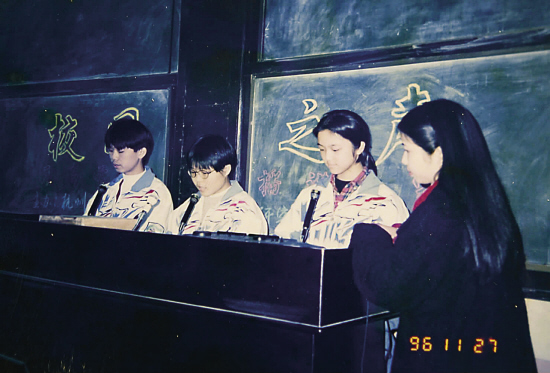 湯唯是班長,又是語文課代表,藝術(shù)天賦很早就表現(xiàn)出來了。1996年11月27日,湯唯與另外兩名同學代表學校參加校園之聲職高學生播音比賽,還獲了獎!八芟矚g各種文藝方面的活動,每次的主題班會都是湯唯與副班長一起主持策劃的!闭f到這班主任肖老師很開心,“只要有她在,我什么都不用操心,只要坐在底下聽就好。她是個很用功的學生。湯唯普通話說得很好,學校的活動很多都是她主持的!