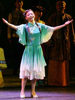 “好一朵美麗的茉莉花……”昨晚身著華服的張靚穎出現(xiàn)在保利劇院的舞臺上。盡管很多人懷疑張靚穎能否勝任歌舞劇《茉莉花》的表演,但她昨天還是交上一份不錯的答卷。與先前在音樂劇《電影之歌》中的表演相比,張靚穎此次表演難度更大。除了民族唱腔的唱段之外,她昨晚的舞蹈水平也有了飛速的進步。雖然其動作身姿還不如中國歌劇舞劇院的專業(yè)舞蹈演員,但其舞技已能和劇情融為一體。(記者王菲)