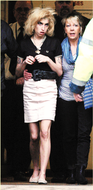美國有“癲后”布蘭妮長期霸占娛樂版面,英國則有“毒后”艾米·懷恩豪斯制造新聞點(diǎn)。上周五她在審訊結(jié)束前5分鐘趕到法庭,為被控傷人及行賄等罪名的25歲老公Blake打氣,還公然于庭上高喊:“老公我愛你!你是最靚仔有型的!”送給Blake一顆定心丸,有目擊者就表示,Blake隨即以口形回應(yīng):“你怎樣啦?”艾米只懂不斷重復(fù):“愛你!愛你!”恩愛得旁若無人。不過艾米當(dāng)天邋遢異常,蓬頭垢面甚至穿著殘舊芭蕾舞鞋就來到法庭了。