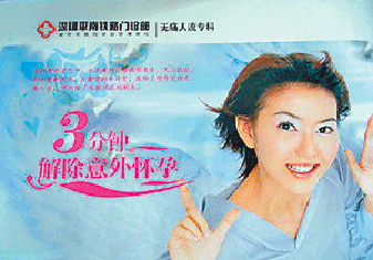 昨日,網(wǎng)友在某論壇爆料,稱孫燕姿舊照被一名為“深圳平南鐵路門診部”的“無痛人流(人工流產(chǎn))?啤北I用成廣告圖片。照片中,孫燕姿身穿藍色休閑裝,甜蜜大笑,而照片下則寫著“3分鐘解除意外懷孕”。