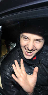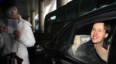 昨日下午從2點多開始,機場大廳就陸續(xù)出現(xiàn)前來接機的歌迷。數(shù)十名鐵桿粉絲裝備齊全,有的手捧鮮花,有的拉開寫著俄語“歡迎回家”字樣的橫幅。15點56分飛機抵達機場,數(shù)分鐘內(nèi),Vitas就飛速地從出口走出,黑夾克黑褲子的他雖然衣著低調(diào),還是被眼尖的歌迷認出,接著機場大廳迅速充斥著呼喊Vitas名字的尖叫聲。眼見歌迷的熱情,Vitas友善地用中文回應大家:“我愛你們!”短短四個字令歌迷更加瘋狂。有人甚至沖破層層障礙沖到Vitas身邊,把鮮花送予其手中,獻花成功的該歌迷立刻引來其他人的羨慕眼光。Vitas行色匆匆地走至停車場,露臉不過短短幾分鐘后,鉆進了黑色寶馬車內(nèi)。臨走前,他一個轉(zhuǎn)身,朝剛才護駕的歌迷送出一個飛吻。