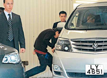 中新網(wǎng)2月27日電 陳冠希昨午2時許再由四季酒店出發(fā)到灣仔警察總部協(xié)助調(diào)查艷照事件。據(jù)香港媒體報道,十多名酒店保安在酒店停車場維持秩序,陳冠?焖俨缴媳D杠囯x開,八名保鑣則乘坐兩輛房車為他護航。