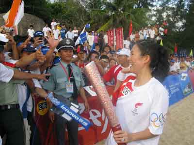 我的火炬?zhèn)鬟f時間在通知單上寫明是六點(diǎn)整,三點(diǎn)不到,我就已經(jīng)在酒店的房間整裝待發(fā)了。乘車將近一個多小時的路程,從亞龍灣到達(dá)我的起跑點(diǎn)——天涯海角。差不多半小時之后,成隊的火炬手同車抵達(dá)集合中心,大家雖然都是初次相逢,但我們此時此刻正在完成著同一個夢想,很快彼此間就變得尤為親切與熟絡(luò)了。所有人都激情澎湃、熱力四射,相互合影留念,相互交流著如何接力火炬,甚至更有人在休息室里擺起了跑步姿勢。最令我難忘的當(dāng)是在我提議周華健大哥唱一首《朋友》時,所有人都鼓掌支持,當(dāng)然周華健大哥絕對沒有令我們失望,他帶動著所有人熱情歌唱。那感覺好像一個大家庭的聯(lián)歡會,親切極了。