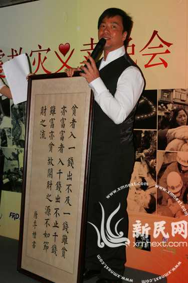 不過,在當(dāng)晚的抗震救災(zāi)義賣晚會上,唐季禮笑得合不攏嘴。他的兩幅書法被拍到了18萬7千元。唐季禮表示,大家都想為災(zāi)區(qū)做點(diǎn)事情,希望這次的義賣可以得到更多的善款支援災(zāi)區(qū)。