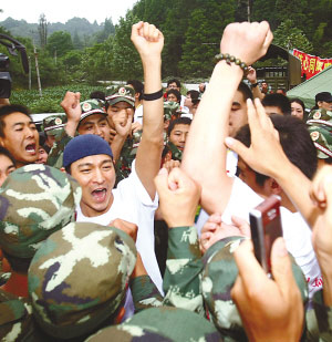 經(jīng)過(guò)兩個(gè)小時(shí)的車程,劉德華一行抵達(dá)了向峨鄉(xiāng)的救援部隊(duì)駐地。得知?jiǎng)⒌氯A等人要來(lái),數(shù)千戰(zhàn)士已在那里等候。看到明星,平靜的現(xiàn)場(chǎng)沸騰起來(lái)。為了維持秩序,士兵們自覺(jué)地手拉手圍成一個(gè)圈,把明星們圍在里面。