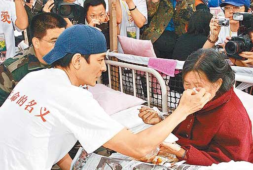 在寺院逗留個(gè)半小時(shí)后,他們又到重災(zāi)區(qū)綿竹一間工廠探訪,工廠負(fù)責(zé)人帶眾星參觀,工人看見(jiàn)華仔、陳道明和葛優(yōu)等紅星顯得很開(kāi)心。為工人打氣后,他們又到臨時(shí)安置區(qū)和臨時(shí)醫(yī)院探訪,醫(yī)護(hù)人員和病人看見(jiàn)華仔等人歡喜若狂,其中華仔在醫(yī)院跟一名75歲老婆婆聊天,老婆婆已接近盲,不知道探望她的是位紅星。老婆婆在地震時(shí)受傷致骨折,她向華仔哭訴,孫女在地震中死亡,華仔見(jiàn)到她如此傷心,也不禁流下男兒淚,但仍不斷安慰婆婆和為她拭淚,還承諾會(huì)照顧她。