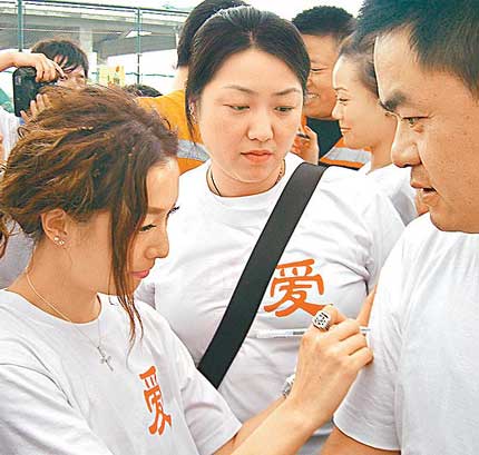 至下午3時(shí)多,他們到成都一間消防局為數(shù)百名消防員打氣,他們是首批進(jìn)入災(zāi)區(qū)徒手在瓦礫中救出幾百名傷者的英雄,華仔和Sammi帶頭向這班消防英雄敬禮。Sammi說(shuō):“第一隊(duì)人入災(zāi)區(qū)以血汗救人,這些人是真英雄!比A仔則說(shuō):“5.12地震發(fā)生后,我先知道內(nèi)地消防員是這樣,她們不顧自己安危,我真是好敬佩!