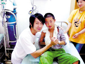 日前林俊杰推卻一切宣傳工作,專程飛抵成都兒童醫(yī)院探望災(zāi)區(qū)重病兒童,并送上禮物給孩子們。在醫(yī)院的ICU病房,林俊杰(見左圖,與受傷小朋友在一起)看望了傷勢較重的王敏和李斯隱,正巧兩人都是林俊杰的超級粉絲。王敏向偶像提出了自己的兒童節(jié)禮物,“能不能為我唱一首《期待愛》?”她靦腆地問道。林俊杰當(dāng)即滿足了孩子的要求,輕聲地唱了起來,病房里頓時充滿了喜悅,受傷的王敏露出了災(zāi)難后的第一次笑容,接下來的病房也變成了小型演唱會的現(xiàn)場,林俊杰與孩子們合唱了很多歌曲。林俊杰表示,希望用自己捐獻的善款建一所希望小學(xué)。