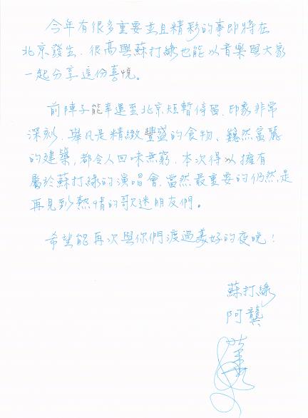 蘇打綠樂團(tuán)的主唱吳青峰在手寫信中這些寫道:“有時生活像一趟不能回頭的旅行,有時候在旅行中生活。音樂和演唱是我的生活,也是讓我用思想旅行的隱形交通,每一次都有絕無僅有的色彩喝精彩。愿我們能共享北京那一次美好!睒穲F(tuán)的鍵盤兼小提琴手的阿龔說到,“今年有很多重要并且精彩的事即將在北京發(fā)生,很高興蘇打綠也能以音樂與大家一起分享這份喜悅。”