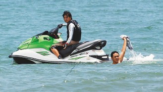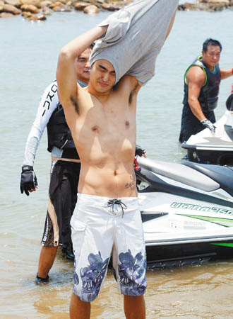 但攝影器材再厲害也沒用,因為阮經(jīng)天被安排在離岸至少100公尺以上的海域,除非狗仔派出水底攝影隊。阮經(jīng)天下水前只略略小露股溝,跳下水后脫掉海灘褲,游了幾下又穿回去,很快回到岸上,他笑說:“剛很怕有小魚小蝦來啄耶!