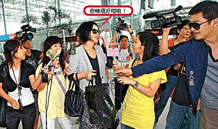 帶備多箱酒送給嘉玲的李亞鵬,與王菲及靖童于昨晨10時(shí)半左右出現(xiàn)曼谷機(jī)場(chǎng),隨即引起大混亂,10多名記者及3間電視臺(tái)攝制隊(duì)將王菲重重包圍,又將麥克風(fēng)遞向王菲她講兩句,她卻說(shuō):“我趕時(shí)間了!”