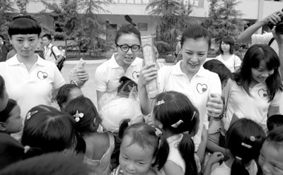 這支明星隊伍很特別:除了劉孜以外,其余都是年輕媽媽,因此特別要求探望災(zāi)區(qū)的小朋友們。一行人早上8點半從成都出發(fā),接近中午時才抵達梓潼的兒童福利院。孫莉和黃磊的女兒多多已經(jīng)快2歲半了,看到這些天真無邪的孩子,孫莉特別心疼,一個勁兒地往他們手里塞各種小禮物。而很久沒出來唱歌的陳明,還自己掏錢給孩子們買了好多彩色橡皮泥。在永安小學(xué)陳明借來一個擴音喇叭,汗流浹背地唱起那首《快樂老家》。今天,愛心媽媽們還將前往德陽的兒童福利院繼續(xù)她們的“獻愛行動”。(記者 喬雪陽 攝影 楊剛)