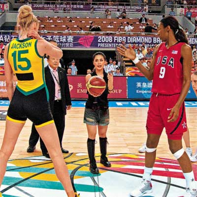 一身黑色打扮的阿嬌,昨晚在浙江為美國(guó)對(duì)澳大利亞的籃球決賽主持開(kāi)球禮。