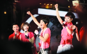 前日是北京奧運開賽首日,陳燮霞和龐偉分別在女子舉重48公斤級和男子十米氣手槍決賽中奪得金牌。為此,可口可樂昨晚在世貿(mào)天街廣場舉行慶祝中國首日奪金的儀式,成龍、S.H.E都出席并與市民一起分享了喜悅心情。當大屏幕上回放陳燮霞奪金的瞬間時,S.H.E三人忍不住在臺上歡呼雀躍。可能是心情太過激動,三人現(xiàn)場演唱第一曲《中國話》時,竟然有點走調(diào)。