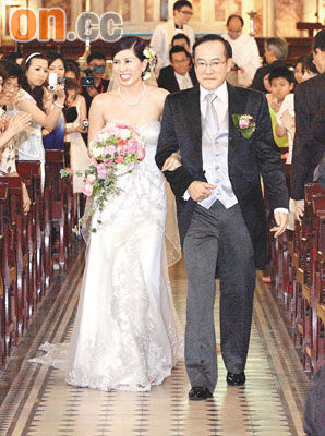 據(jù)了解,劉志敏昨晨接新娘時,除了闊綽地給五位數(shù)字開門紅包外,還與眾同樂,找出姐妹團預(yù)先收藏的“心心相印”兩顆心形貼紙,又以打油詩道出愛的宣言。雖然劉志敏身家豐厚,但對新娘相當(dāng)細心。當(dāng)兩人乘坐價值逾630萬元港幣的勞斯萊斯PHANTOM轎車抵達座堂時,他極有風(fēng)度地主動為羅慧娟開車門,更為有聽力障礙的她安排貼身保鏢侍候在側(cè),體貼無微不至。而羅慧娟身穿象牙白色低胸婚紗,配上珍珠及鉆石的頸鏈戒指,分外明艷照人。