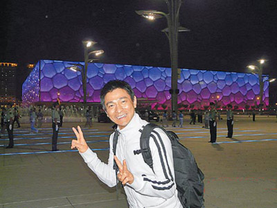 劉德華在水立方前興奮留影。