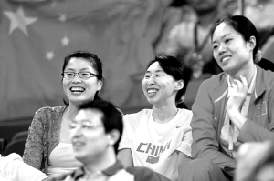 葉莉和前隊友苗立杰坐在一起,戴著眼鏡的葉莉一直在默默為姚明加油。不過當中國男籃最終大比分輸?shù)舯荣惡,葉莉的神色也有些黯然……
