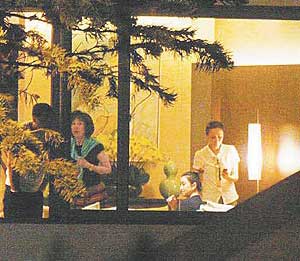 中新網(wǎng)8月26日電 “梁太太”劉嘉玲婚后沒有改變社交生活的習(xí)慣,動(dòng)不動(dòng)就請友人到家飲酒餐敘,前晚北京奧運(yùn)在鳥巢的閉幕式,她又找來3男3女好友到山頂?shù)脑⑺鶜g聚,梁朝偉(偉仔)雖然不好應(yīng)酬,但他仍然極力扮演男主人的角色,當(dāng)友人對(duì)他家花瓶感到興趣時(shí),他立刻充當(dāng)藝術(shù)品指導(dǎo)仔細(xì)講解。
