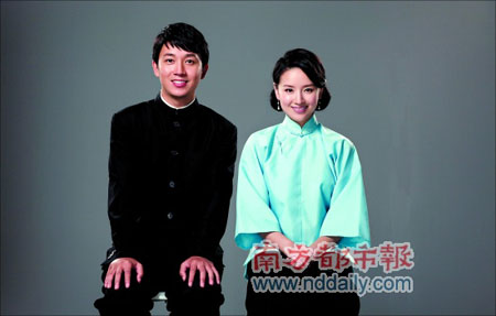 董潔和潘粵明一中一西的兩款結(jié)婚照,都是喜氣洋洋。