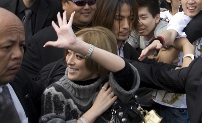 昨日中午11點25分,濱崎步乘坐的JL8877班機從東京羽田機場飛抵上海虹橋機場,當聽到機場廣播該航班抵達消息時,歌迷們一下子瘋狂起來,大聲喊著“AYU!AYU!(濱崎步的名字)”。約11點38分,身材嬌小的濱崎步在20余名黑衣貼身保鏢以及數(shù)名工作人員的簇擁下現(xiàn)身,整個候機大廳立即陷入瘋狂,歌迷們一邊哭喊著濱崎步的名字,一邊開始朝濱崎步瘋狂跑去,貼身保鏢張開的雙臂也無法阻擋熱情的歌迷。