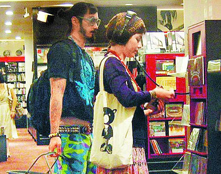 范曉萱(右)試聽CD,男友Allen提著購物籃在旁等她。