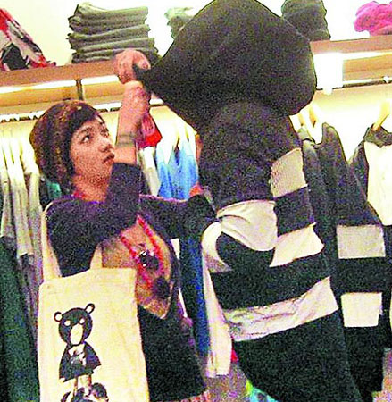 兩人在服飾店挑衣服,她調皮地將頭套封住捉弄Allen。