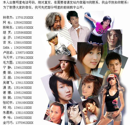 近日,原某國(guó)際唱片公司員工,年僅19歲的知名宣傳cirry(陳琪)電話遭盜,手機(jī)里88名明星電話也被盜竊者公布于網(wǎng)絡(luò),被曝名單中包括林俊杰、陳曉東、金莎、胡靈、阿杜、謝娜、阿清、朱晨辰、馬天宇、吉米、好男吳建飛、快男劉洲成、好男毛方圓、超女盧潔云、秦麗、型秀王超、瀟浪、制片人張紀(jì)中、主持人李詠、袁泉、韓國(guó)藝人SARA等88名香港內(nèi)地明星電話號(hào)碼被曝光,不少明星已被多次騷擾,不得已換號(hào)碼。