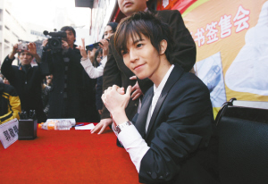 郭敬明一出現(xiàn),粉絲們開始躁動,手機、相機照相的咔嚓聲和“不要擠不要擠”的尖叫聲此起彼伏。簽售正式開始。排在第一位的小女生飛快地沖了上來,她遞上了幫別人帶的禮物盒,興奮地看著“郭敬明”三個字落在書的扉頁上。女生還想讓郭敬明給自己寫一段話,只可惜沒能得逞,因為后面等候的人實在是太多了。