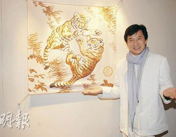 成龍與某品牌合作推出老虎圖案的限量版絲質(zhì)披肩,將會(huì)在香港義賣(mài)籌款。(圖片來(lái)源:明報(bào))