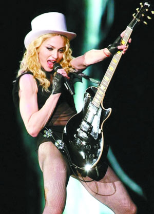 演唱會(huì)上,麥當(dāng)娜仍然堅(jiān)持一貫的熱歌辣舞的風(fēng)格,當(dāng)麥當(dāng)娜唱完第二首歌后,坐在第一排的埃里克斯從舞臺(tái)下給麥當(dāng)娜遞上一瓶水。(圖片來源:新京報(bào))