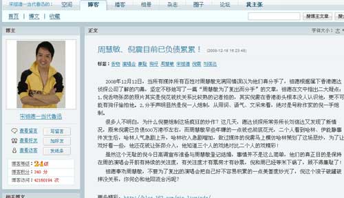 宋祖德在博客里面寫道,他是從自己下屬某公司獲得該內(nèi)幕的,除了知道他們是在炒作外,還獲悉倪震已經(jīng)負(fù)債500萬港幣。并炮轟倪震借鑒“伊能靜與庾澄慶婚變事件”策劃出這一起分手復(fù)合戲,其意是在保持周慧敏的關(guān)注度,以便提高周慧敏的演唱會票房牟利。田雯