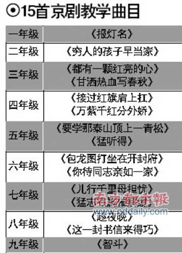 昨日廣東省教育廳體育衛(wèi)生與藝術教育處副處長何志強告訴記者,他剛剛看到了教育部的文件。要求是每省選擇一個重點市開展試點,每省選20所學校,分別是10所小學和10所初中,在音樂課程中增加京劇曲目教學。教育部要求從2008年3月到2009年7月在北京、天津、黑龍江、上海、江蘇、浙江、江西、湖北、廣東、甘肅等10省市開展試點工作,并在試點的基礎上逐步在全國推開。