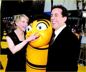 10月28日晚,洛杉磯西木區(qū)的曼恩鄉(xiāng)村劇院成為“蜜蜂”的世界,一輛輛漆成黃底黑條的甲殼蟲汽車停在劇院外,走下車的是好萊塢女星蕾妮•齊薇格和喜劇明星杰瑞•宋飛,在同樣黃黑相間的地毯另一端,一只巨型大蜜蜂卡通玩偶早已恭候多時,動畫新片《蜜蜂總動員》首映就這樣熱鬧登場了。