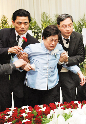 孫道臨的靈柩停放在靈堂中間,紅色玫瑰包圍中的他身披黨旗,面容安詳。靈柩正前方擺放著五個(gè)小花圈,來自孫道臨的近親屬,中間孫夫人王文娟送的花圈用紅玫瑰擺放成心型,夫妻情深可見一斑。靈堂兩邊也擺放著白玫瑰做成的花圈,其中有來自江澤民、溫家寶等領(lǐng)導(dǎo)人的,有來自秦怡、張瑞芳等老藝術(shù)家的,也有來自上影集團(tuán)等單位團(tuán)體的,所有人都用自己的方式向?qū)O道臨的逝世表示了最沉痛的哀悼。