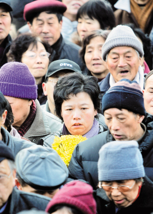 上午九點(diǎn)左右,沒有哀怨的哀樂,孫道臨追悼會(huì)在一種平和安詳?shù)臍夥罩羞M(jìn)行。孫道臨的妻子王文娟以及他們的兒女和孫子女靜靜地站在靈堂一角,淚流滿面,面容悲慟。九點(diǎn)一刻左右,群眾吊唁儀式開始,等候多時(shí)的群眾手持鮮花,井然有序地排隊(duì)進(jìn)場(chǎng)。追悼會(huì)于上午十點(diǎn)半左右結(jié)束,一個(gè)半小時(shí)的時(shí)間內(nèi),前來吊唁的群眾將近萬人。