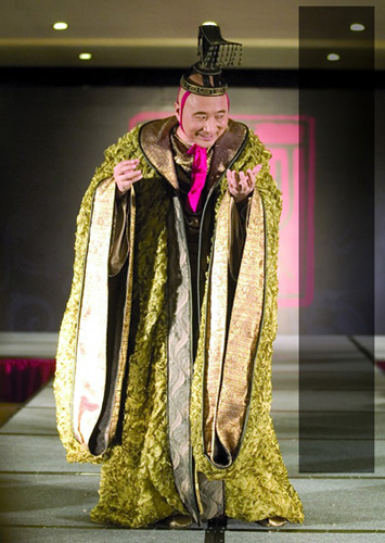 陳佩斯身穿金黃色龍袍在T臺上大作秀,“阿斗”的服裝是雙面設(shè)計,被陳佩斯稱為節(jié)約的龍袍。