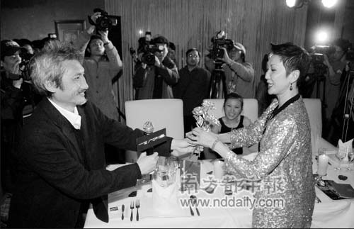 今年婦女節(jié),徐克導(dǎo)演的新戲《女人不壞》在北京舉辦記者會(huì),當(dāng)時(shí)四位主角向?qū)а菪炜怂蜕辖鹕倒,轉(zhuǎn)頭,徐克就將玫瑰送給了施南生,并深情地說:“金玫瑰當(dāng)然要給最好的女人,你永遠(yuǎn)是最好的女人!