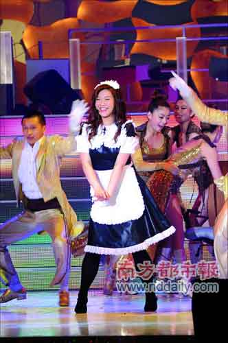 隨著胡楓一聲大喊:“歡迎光臨麗花皇宮,”恍惚又回到了當(dāng)年肥姐的麗花皇宮時(shí)代。劉雅麗、陳潔靈開始大秀歌舞,一身女傭打扮的欣宜則作為招待在招呼客人,看到別人載歌載舞心癢癢,于是跳出來主動(dòng)要求表演,結(jié)果還穿著女傭服裝的她又唱又跳了一曲《我要》,贏得眾人的掌聲。接下來,欣宜又換上黑色連身裙唱了一曲《IWILLFOLLOWHIM》以及《勁草嬌花》,引得不少觀眾在座位上大叫“欣宜,欣宜”。