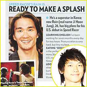 美國演員卡爾·楊最近是春風得意,剛剛主演了沃卓斯基導演的《極速賽車手》不說,還“錯誤地”登上了美國著名的《人物》雜志!度宋铩冯s志的編輯把卡爾·楊誤認為是韓國明星Rain,在照片邊上還配了一段文字:“他在韓國是鼎鼎大名的超級巨星,本名叫鄭智熏,粉絲們都稱他‘Rain’,《極速賽車手》是他投身好萊塢的第一步! 微特