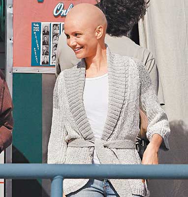 中新網(wǎng)5月23日電 臺灣媒體報道,好萊塢女星卡梅隆·迪亞茲(Cameron Diaz)光頭造型亮相。她為暢銷書改編的新片《姊姊的守護者》(My Sisters Keeper)犧牲色相,戴上頭套扮光頭,被媒體嘲笑很像12年前的電影《星戰(zhàn)毀滅者》(Mars Attacks!)中的火星人。