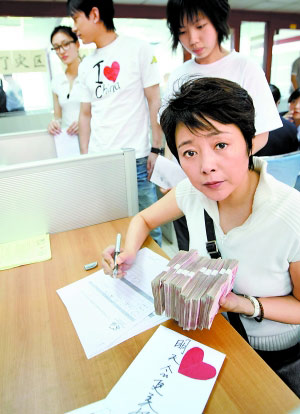 前天,從寧波外景地直接趕回北京的著名演員張瑜,從北京機(jī)場(chǎng)直接來(lái)到中國(guó)扶貧基金會(huì),為汶川災(zāi)區(qū)的孩子們?cè)倬?0萬(wàn)元善款。和張瑜一道同來(lái)的還有張瑜導(dǎo)演的電影《八十一格》的兩位青年主演王麗坤和王睿。張瑜說(shuō),10萬(wàn)元對(duì)災(zāi)區(qū)人們來(lái)說(shuō),也許是杯水車(chē)薪,但現(xiàn)在災(zāi)區(qū)孩子需要的不僅僅是錢(qián),他們更需要心靈醫(yī)治和撫慰。