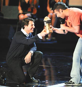 據(jù)臺(tái)灣“聯(lián)合報(bào)”報(bào)道,MTV電影獎(jiǎng)由一大票青少年觀眾選出,他們被視為票房主流,因此吸引大明星捧場出席,像湯姆·克魯斯今年又來了,不僅帶了“湯嫂”凱蒂同行,還在舞臺(tái)上半跪頒發(fā)MTV世代大獎(jiǎng)給喜劇男星亞當(dāng)·桑德勒。
