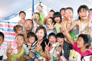 演員陳好除參加多場義演投身抗災事業(yè)外,6月1日更到都江堰親手為災區(qū)的小朋友獻上特別的禮物。當日,陳好(與災區(qū)小朋友一起過六一)先后趕往西南財經(jīng)大學、都江堰的兩個受災群眾安置點,為兩個地方的小朋友帶去玩具作為兒童節(jié)禮物,并與他們聊天、談心。一個震后因為懼怕和外界交流、一直不肯上幼兒園的小女孩,在陳好的勸說下,不僅愿意繼續(xù)學業(yè),還送給陳好一個香囊,讓陳好感動不已。陳好表示:“我只是想盡自己的一份心意,但沒想到,在贈予他們禮物的同時,還會有小朋友給予我回贈,我會一直保存下去。”陳好也通過媒體呼吁、號召大家多捐課桌椅和文具用品。