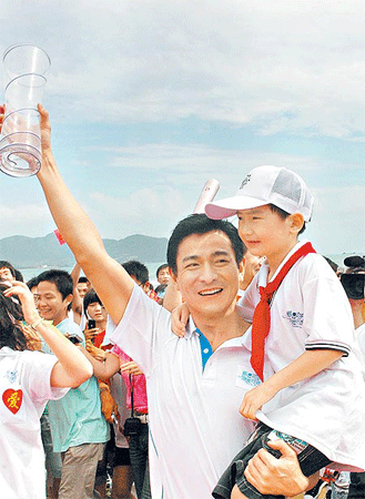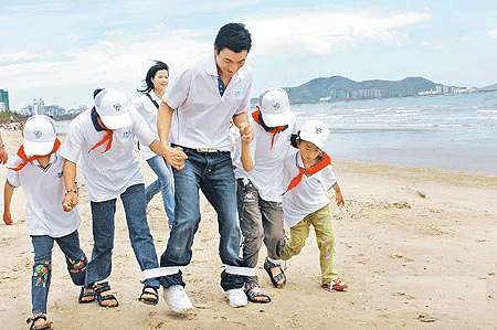 中新網(wǎng)6月6日電 據(jù)臺灣媒體報(bào)道,劉德華(華仔)日前帶著80名災(zāi)區(qū)小朋友,參加在海南島三亞灣舉辦的“汶水入!彼拇ㄙc災(zāi)活動。華仔與小朋友玩起5人6腳在500米長的沙灘上進(jìn)行接力傳遞,華仔最后還抱起1名災(zāi)區(qū)小朋友,將象征愛心與祝福的汶川之水舉起倒入大海,完成儀式。