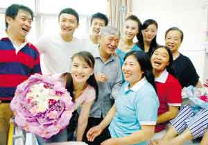 昨天的戲在中南醫(yī)院拍攝,得知中南醫(yī)院住著不少?gòu)乃拇ㄞD(zhuǎn)移過來的四川受災(zāi)同胞,演員們又拿著鮮花和水果,到病房探望傷員,祝他們?cè)缛湛祻?fù)。丁海峰、黃小蕾……一個(gè)個(gè)只有電視上才能看到的演員突然出現(xiàn)在自己身邊,傷員都非常高興,李明啟老師最受歡迎,所到之處笑聲一片,大家都圍著她合影。該劇制片人表示,得知汶川災(zāi)情后,劇組雖然還在趕戲,但也通過各種渠道給災(zāi)區(qū)捐了款,“災(zāi)區(qū)同胞需要我們的關(guān)懷,一方有難,八方支援,相信明天會(huì)更好!